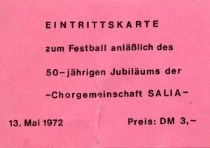 Der 50. Geburtstag des Männerchores der Chorgemeinschaft Salia ist das große Ereignis des Jahres 1972. Der Frauenchor ist eigentlich einige Jahre jünger, aber das lassen wir unter den Tisch fallen. Im „Kuhstall“ (heute Sasel-Haus) findet – wie üblich – unser Festkonzert statt, zu dem wir uns einheitlich festliche Kleidung besorgt hatten.